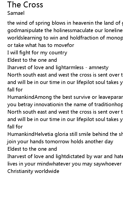 | North south east and west the cross is sent over the landskeep draining what was and will be in our time in our lifepilot soul takes you on the ride, no rise no fall for | |