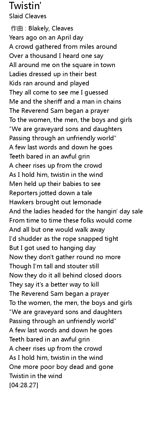 | [04:23.20] | Twistin in the wind |