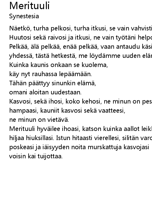 | Merituuli hyv ilee ihoasi, katson kuinka aallot leikkiv t | |