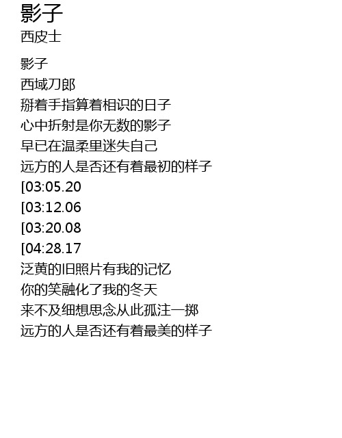 | [04:36.07][04:28.17][03:26.93][02:56.36][01:25.49] | màn màn de màn màn de cóng cǐ wǒ jiù biàn chéng nǐ de yǐng zi |