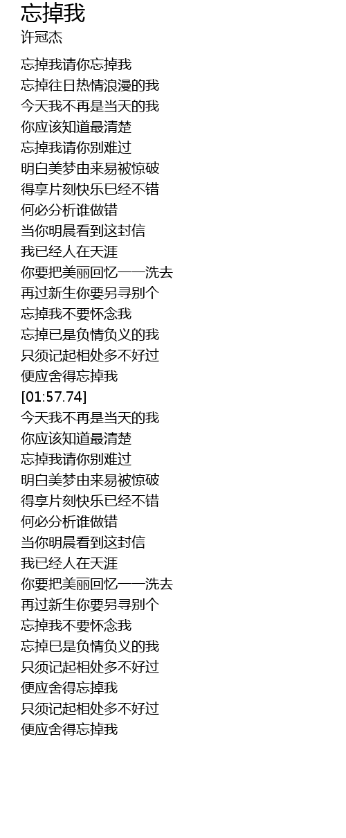 | [01:39.72] | 忘掉已是负情负义的我 |