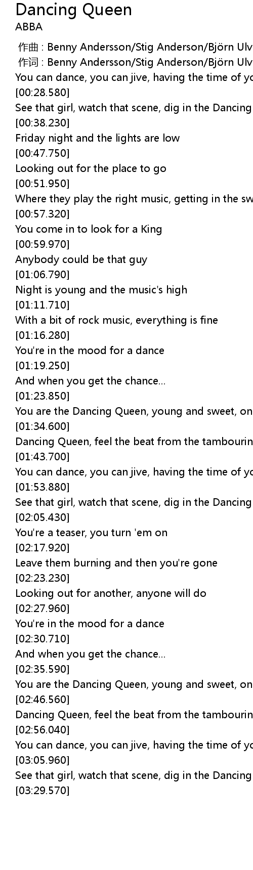| [02:47.880] | Dancing Queen, feel the beat from the tambourine |
