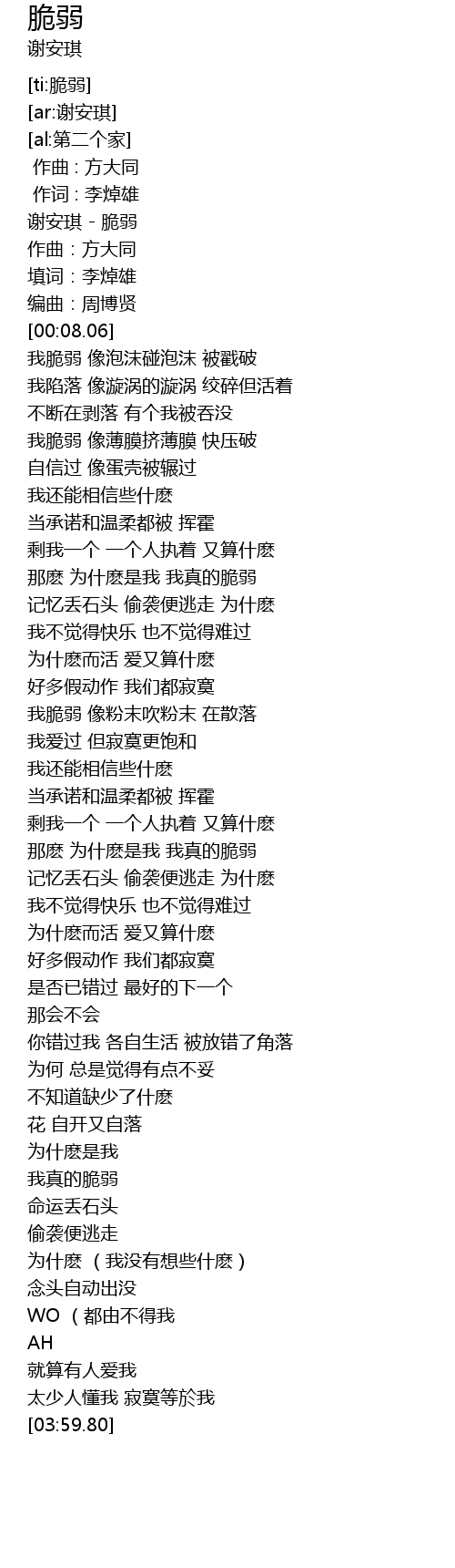 | [00:01.20] | 谢安琪 - 脆弱 |