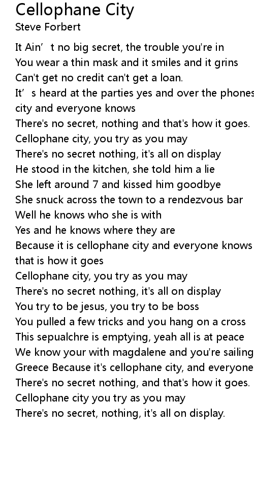 | Because it is cellophane city and everyone knows there's no secret nothing and that is how it goes | |