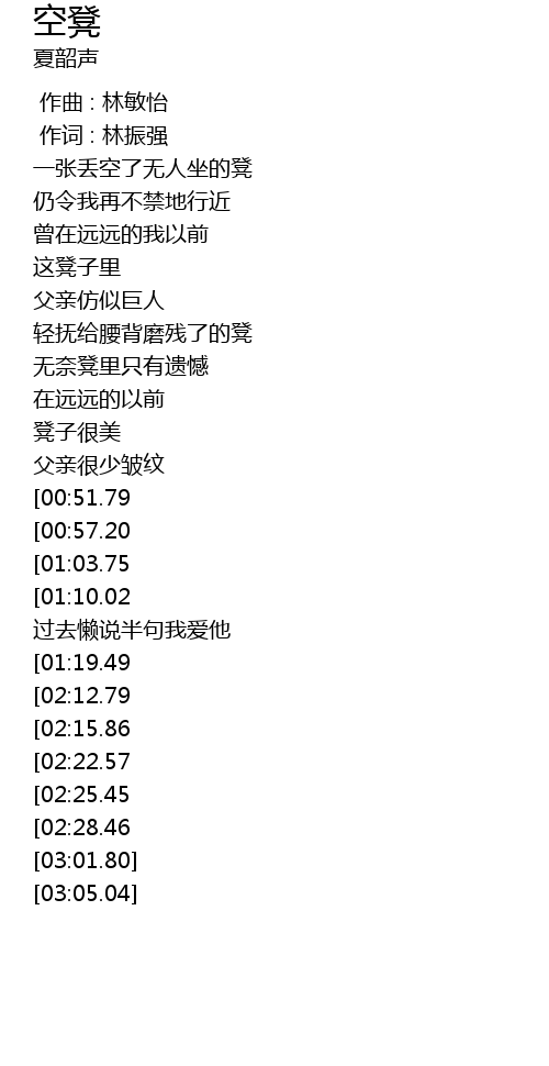 | [02:50.62][02:28.46][01:38.56] | 听我叫喊只得一张空凳 |