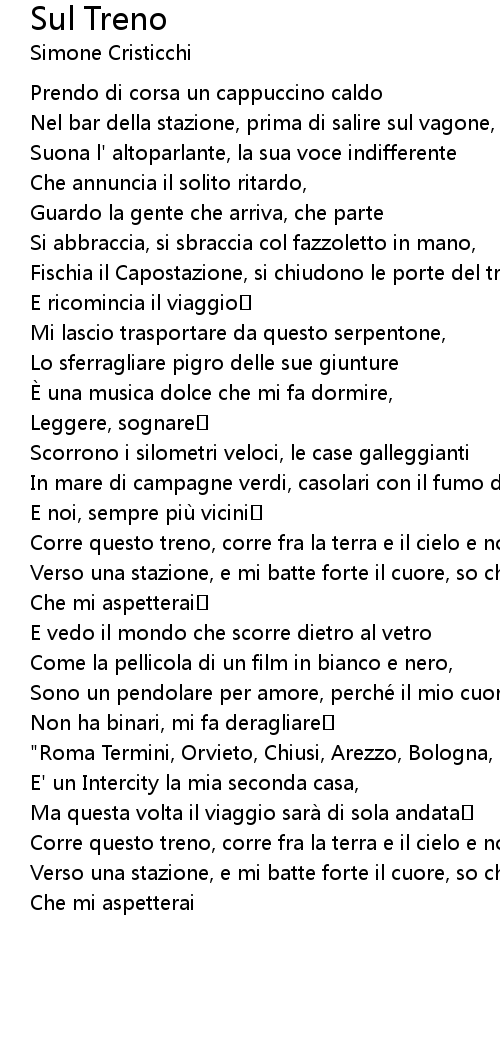 | Corre questo treno, corre fra la terra e il cielo e non si ferma mai, | |
