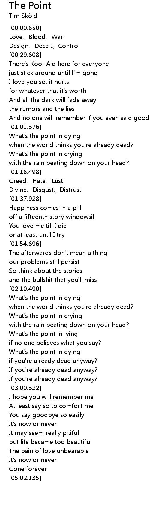 | [02:11.406] | What' s the point in dying |