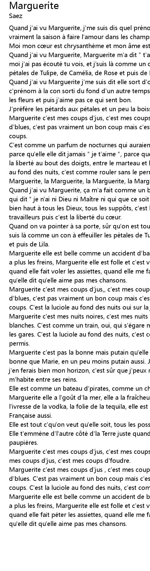 | Marguerite c'est mes coups d'jus , c'est mes coups d'foudre, c'est mes coups d'blues. C'est pas vraiment un bon coup mais c'est dans l'mille à tous les coups. C'est la luciole au fond des nuits, c'est comme rouler sans le permis. Marguerite elle est belle comme un accident de bagnole, comme un poids lourd qui a plus les freins, Marguerite elle est folle et c'est vrai que moi j'aime bien quand elle fait péter les assiettes, quand elle me fait péter les plombs, qu'elle dit qu'elle aime pas mes chansons. |
