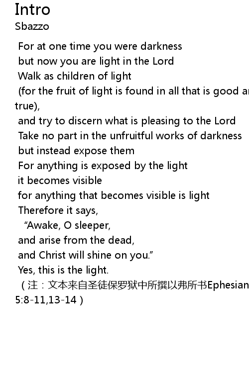 | [01:02.10] | (注:文本来自圣徒保罗狱中所撰以弗所书Ephesians 5:8-11,13-14) |