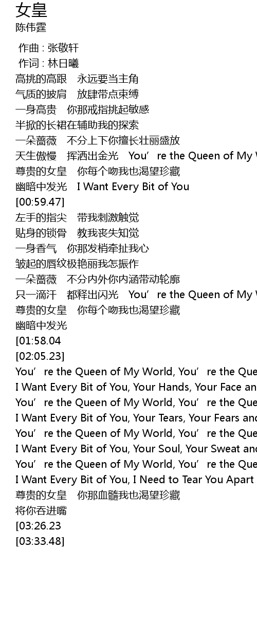 | [01:32.65] | 尊贵的女皇 你每个吻我也渴望珍藏 |