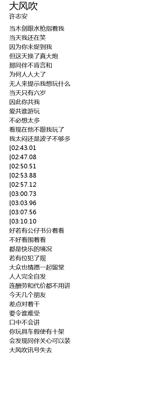 | [01:21.57][02:57.12][03:31.13] | 继续大风吹讯号失去 |