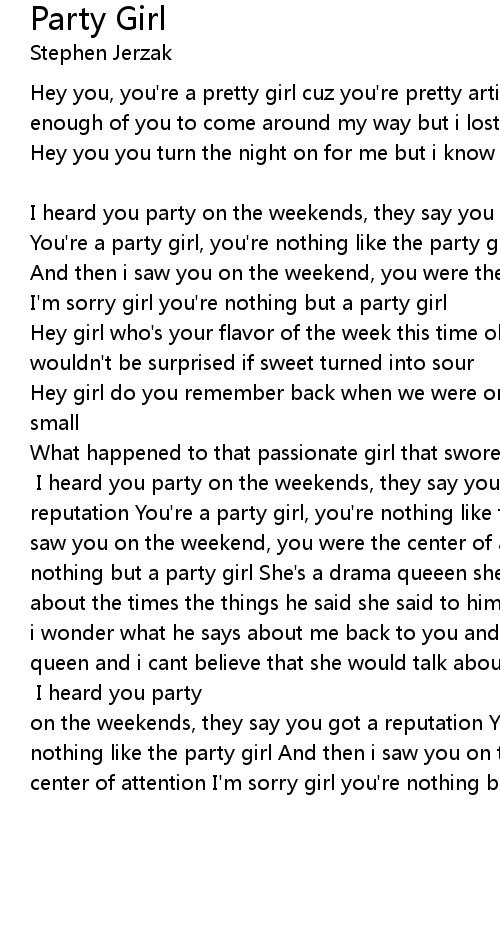 What happened to that passionate girl that swore to me wouldn't become part of a sorority (: [chorus:] I heard you party on the weekends, they say you got a reputation You're a party girl, you're nothing like the party girl And then i saw you on the weekend, you were the center of attention I'm sorry girl you're nothing but a party girl She's a drama queeen she talks to him, he talks to me about the times the things he said she said to him about me I'm over honesty but i wonder what he says about me back to you and if its even true She's a drama queen and i cant believe that she would talk about me and never to me I'm all for dignity but I'm almost happy that she hates me [chorus:] I heard you party on the weekends, they say you got a reputation You're a party girl, you're nothing like the party girl And then i saw you on the weekend, you were the center of attention I'm sorry girl you're nothing but a party girl. |