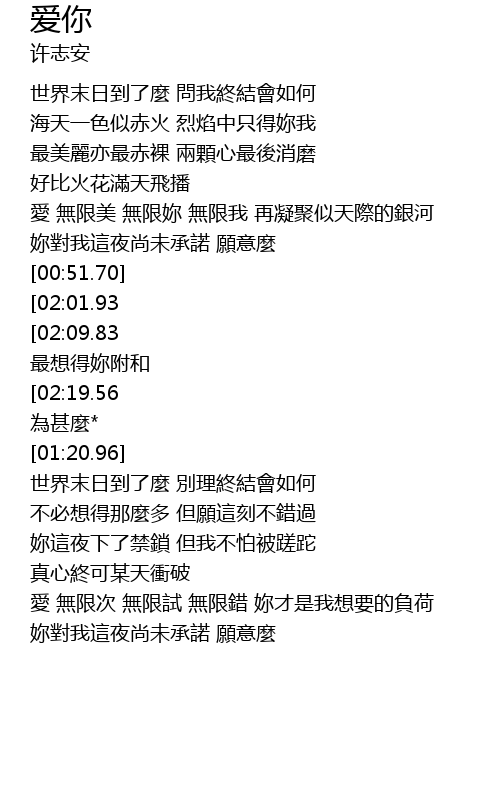 | [02:29.96][02:01.93][00:52.00] | *愛妳 我管不了是禍 未想過是為何 |