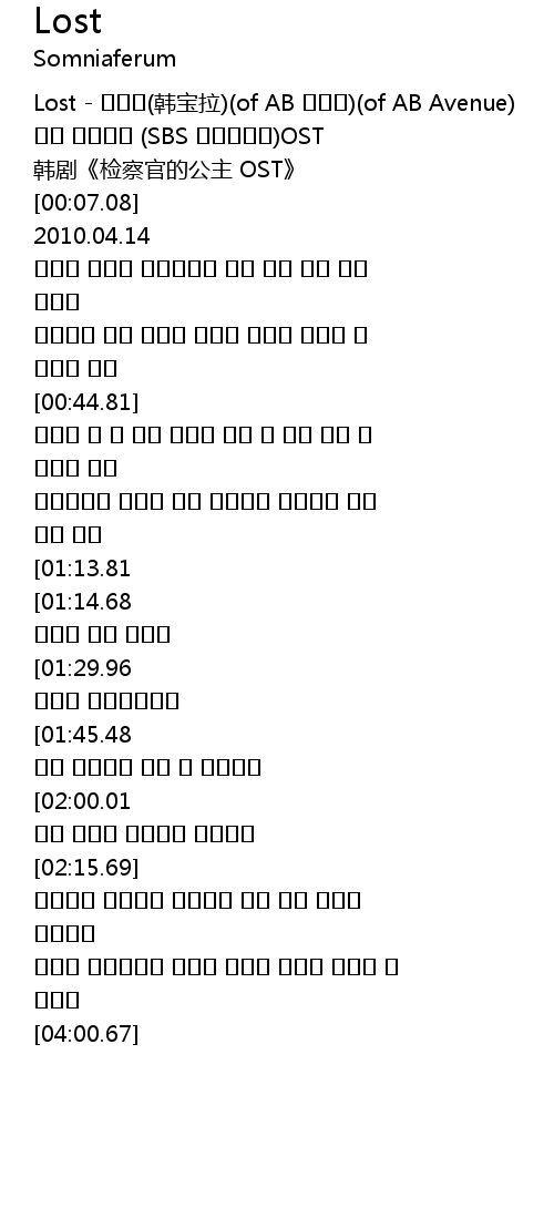 | [00:01.37] | Lost - 한보라(韩宝拉)(of AB 에비뉴)(of AB Avenue) |