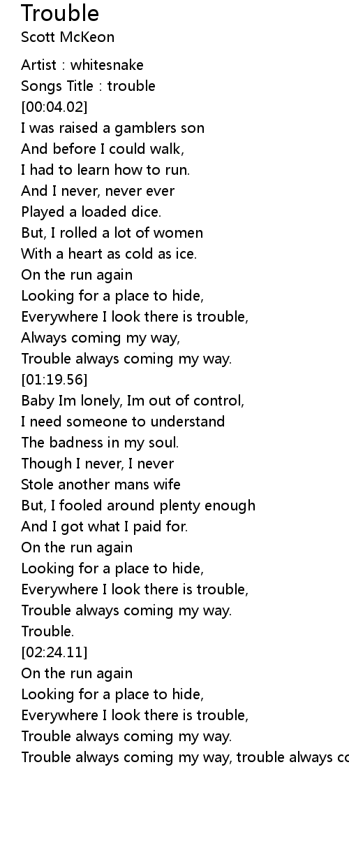 | [03:41.98] | Trouble always coming my way, trouble always coming... |