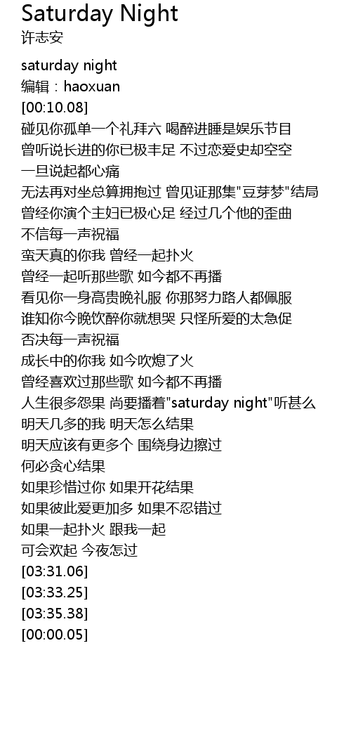 | [02:06.01] | 人生很多怨果 尚要播着"saturday night"听甚么 |
