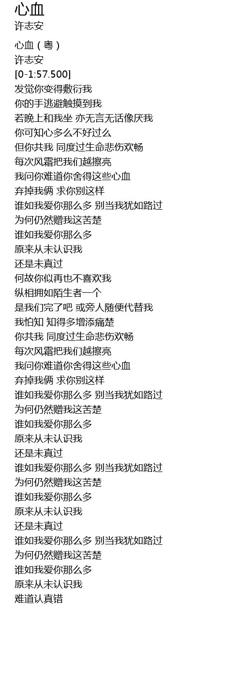 | [00:56.500] | wǒ wèn nǐ nán dào nǐ shè de zhèi xiē xīn xuè |