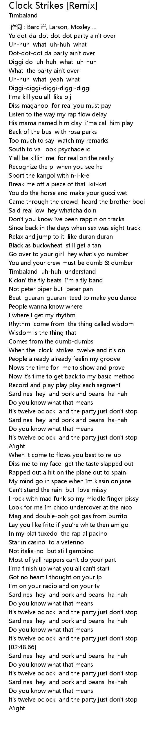 | [02:45.72] | It's twelve oclock and the party just don't stop |