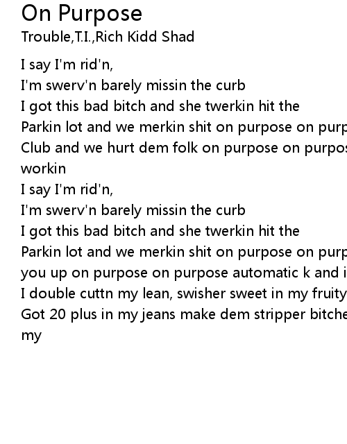 Parkin lot and we merkin shit on purpose on purpose don't try me dawg well fuck you up on purpose on purpose automatic k and it's swerv'n |