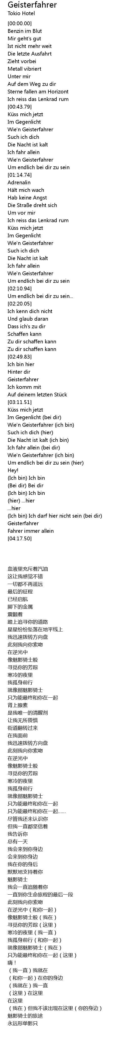 | [03:19.64] | Wie'n Geisterfahrer (ich bin) |