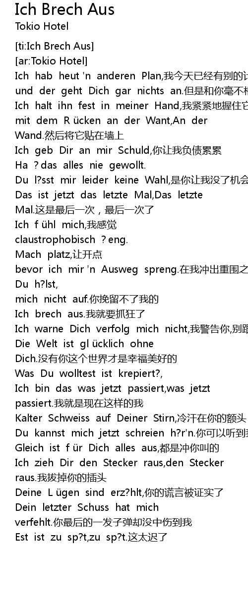 | [01:32.44] | Gleich ist f ür Dich alles aus,都是冲你叫的 |