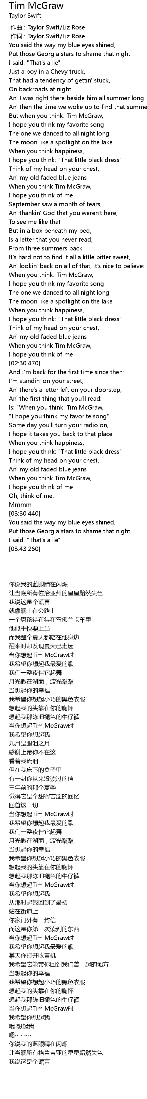 | [02:25.780] | 当你想起Tim McGraw时 |