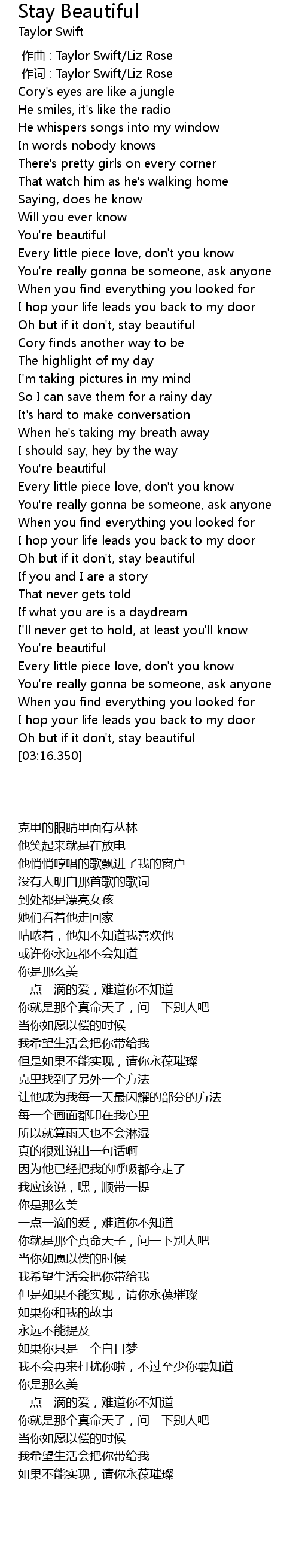 | [00:01.00] | 作词 : Taylor Swift/Liz Rose |