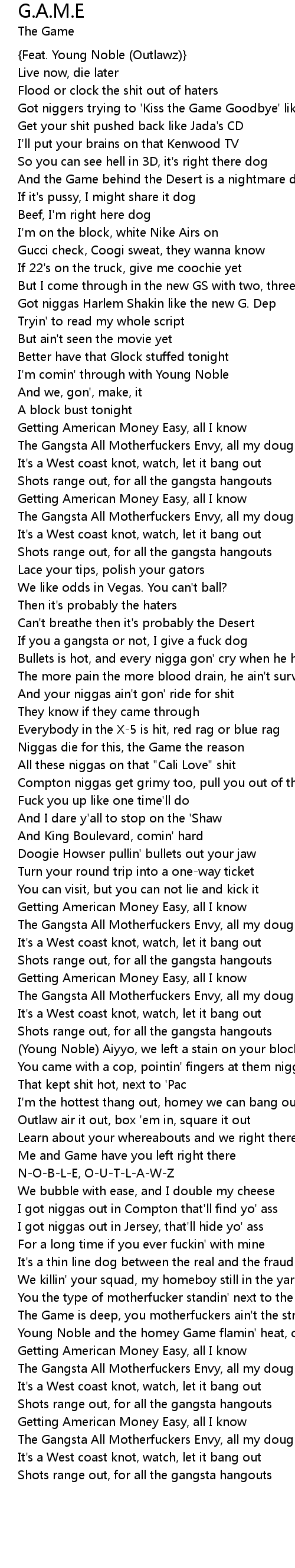 Niggas die for this, the Game the reason |