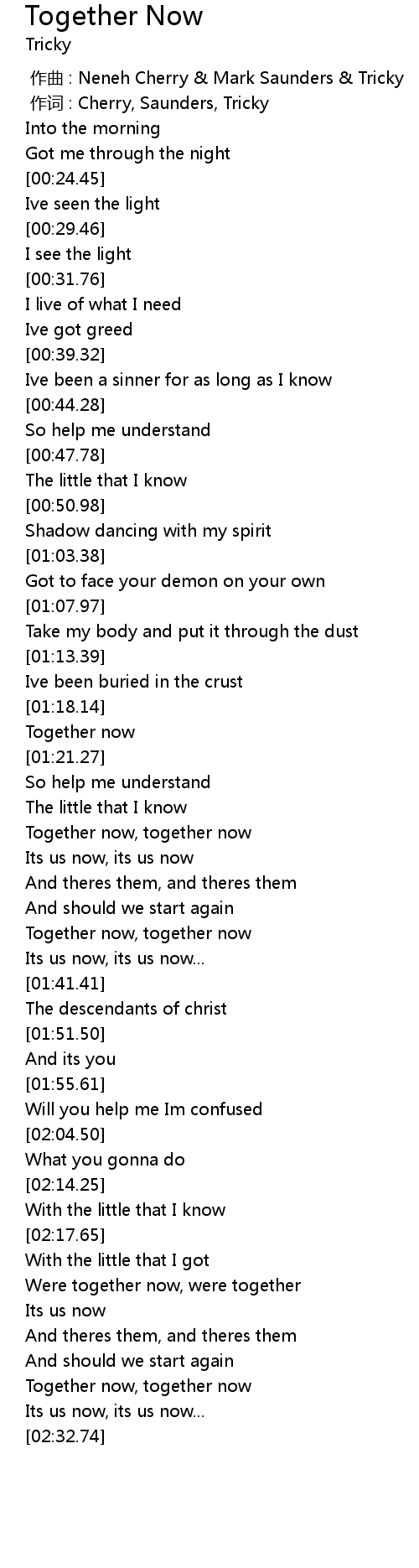 | [00:00.00] | 作曲 : Neneh Cherry & Mark Saunders & Tricky |