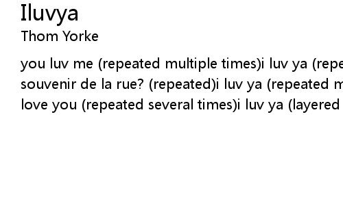 | you luv me (repeated multiple times)i luv ya (repeated multiple times)un souvenir de la rue? (repeated)i luv ya (repeated multiple times in two layers)i love you (repeated several times)i luv ya (layered over the previous vocals) |
