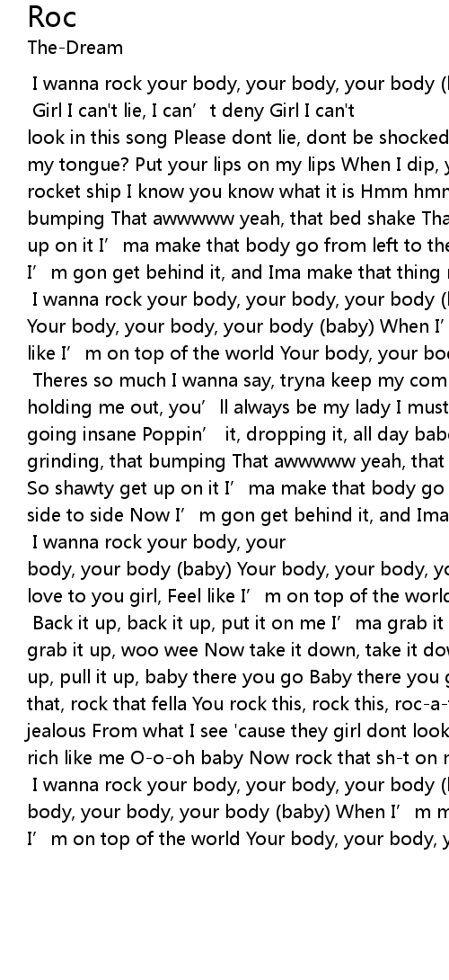 | Chorus I wanna rock your body, your body, your body baby Your body, your body, your body baby The Dream Girl I can' t lie, I can' t deny Girl I can' t look in this song Please dont lie, dont be shocked When you taste your love in my tongue? Put your lips on my lips When I dip, you dip, we dip Take off on my rocket ship I know you know what it is Hmm hmm, good loving That grinding, that bumping That awwwww yeah, that bed shake That next day, body ache So shawty get up on it I' ma make that body go from left to the right From side to side Now I' m gon get behind it, and Ima make that thing ride ride Roc, roc, roc, roc Roc, roc, roc, roc Chorus I wanna rock your body, your body, your body baby Your body, your body, your body baby When I' m making love to you girl, Feel like I' m on top of the world Your body, your body, your body baby The Dream Theres so much I wanna say, tryna keep my composure babe While you holding me out, you' ll always be my lady I must admit what you doing got me going insane Poppin' it, dropping it, all day babe Hmm hmm, good loving That grinding, that bumping That awwwww yeah, that bed shake That next day, body ache So shawty get up on it I' ma make that body go from the left to the right From side to side Now I' m gon get behind it, and Ima make that thing ride ride Roc, roc, roc, roc Roc, roc, roc, roc Chorus I wanna rock your body, your body, your body baby Your body, your body, your body baby When I' m making love to you girl, Feel like I' m on top of the world Your body, your body, your body baby The Dream Back it up, back it up, put it on me I' ma grab it up, grab it up, woo wee Now take it down, take it down, nice and slow Now pull it up, pull it up, baby there you go Baby there you go See I' mma rock that, rock that, rock that fella You rock this, rock this, rocafella Its okay that they jealous From what I see ' cause they girl dont look like you And the niggs ain' t rich like me Oooh baby Now rock that sht on me Round and round, up and down Ohohoh ohhh Chorus I wanna rock your body, your body, your body baby Your body, your body, your body baby When I' m making love to you girl, Feel like I' m on top of the world Your body, your body, your body baby |