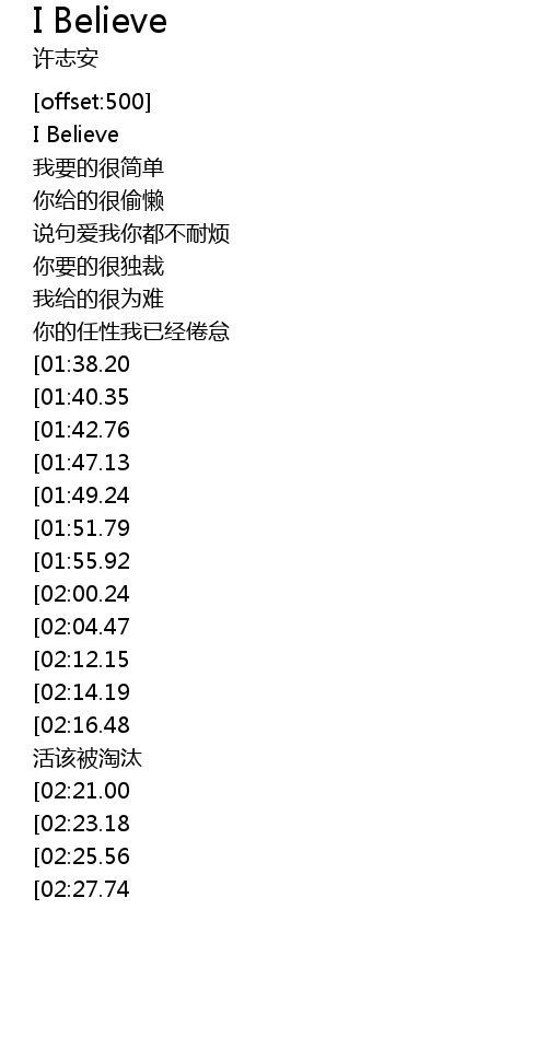 | [01:19.93][02:21.00][02:39.31][03:15.48] | I Believe 爱应该自在 |