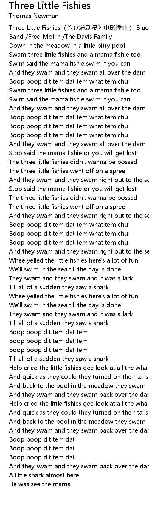 | [00:00.00] | Three Little Fishies hǎi dǐ zǒng dòng yuán diàn yǐng chā qǔ Blue Sea Band Fred Mollin The Davis Family |