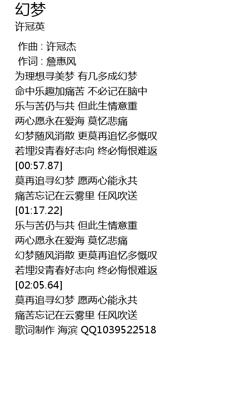 | [01:00.12] | 莫再追寻幻梦 愿两心能永共 |