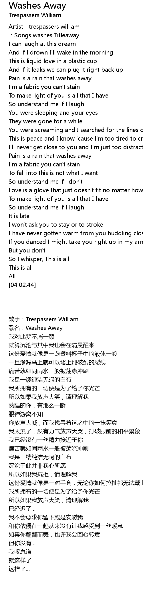 | [00:02.55] | 歌名:Washes Away |