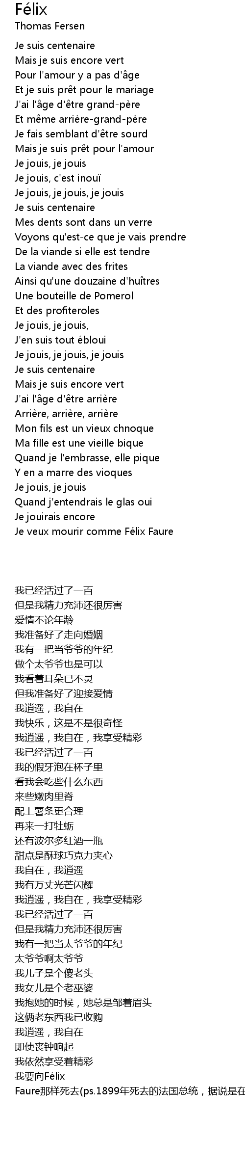 | [02:15.71] | 我要向Félix Faure那样死去(ps.1899年死去的法国总统,据说是在爱丽舍宫和30岁的情妇啪啪啪时意外死亡......) |