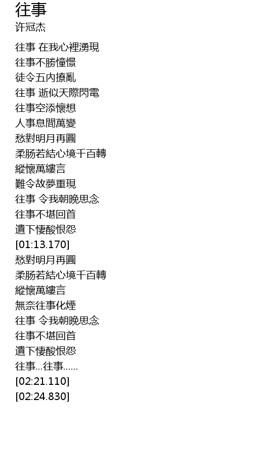 | [02:03.610] | wǎng shì... wǎng shì...... |
