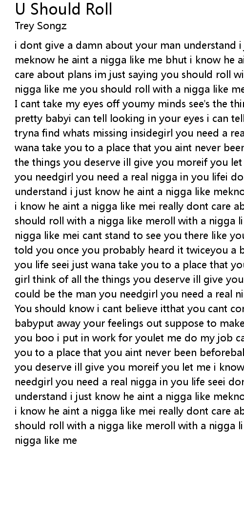 You should know i cant believe itthat you cant conceiveits suppose to be us here babyput away your feelings out suppose to make it clear to yai aint tryna hurt you boo i put in work for youlet me do my job cause i go hard soi just wana take you to a place that you aint never been beforebaby girl think of all the things you deserve ill give you moreif you let me i know i could be the man you needgirl you need a real nigga in you life seei dont give a damn about your man understand i just know he aint a nigga like meknow he aint a nigga like me bhut i know he aint a nigga like mei really dont care about plans im just saying you should roll with a nigga like meroll with a nigga like me you should roll with a nigga like me |