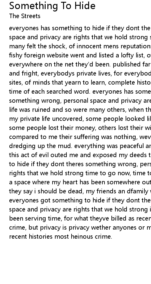 everyones has something to hide if they dont theres something wrong, personal space and privacy are rights that we hold strong so devestating was the day and many felt the shock, of innocent mens reputations wrecked upon the rocks, when a fishy foreign website went and listed a lofty list, of everybodys names and everywhere on the net they'd been. published far and wide, to the publics alarm and fright, everybodys private lives, for everybodys prying eyes late nights on sites, of minds that yearn to learn, complete histories of mischeifs and the time of each searched word. everyones has something to hide if they dont theres something wrong, personal space and privacy are rights that we hold strong my life was ruined and so were many others, when that fishy foreign website posted my private life uncovered, some people looked like fools, others ostracised, some people lost their money, others lost their wives, but for the others compared to me their suffering was nothing, weve all been made to pay by them dredging up the mud. everything was peaceful and people were forgetting, til this act of evil outed me and exposed my deeds to them everyones got something to hide if they dont theres something wrong, personal space and privacy are rights that we hold strong time to go now, time to part with a prayer, there is a space where my heart has been somewhere out there,they say i am a monster, they say i should be dead, my friends an dfamily will never speak to me again everyones got something to hide if they dont theres something wrong, personal space and privacy are rights that we hold strong i feel bad for the man, who had been serving time, for what theyve billed as recent histories most heinous crime, but privacy is privacy wether anyones or mine, even if i did commit recent histories most heinous crime. |