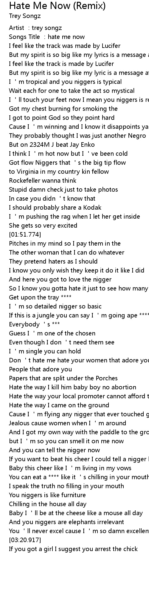 | [01:34.878] | Got flow Niggers that 's the big tip flow |