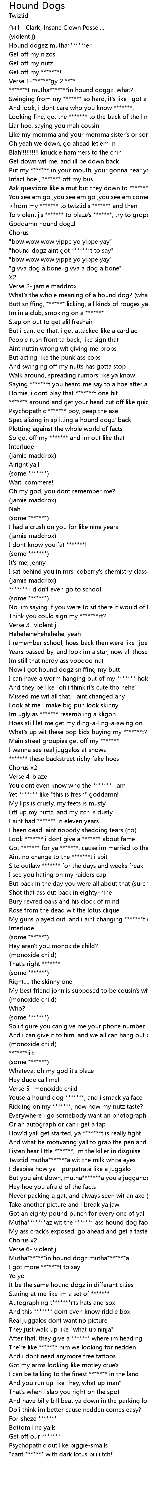| To violent j's ******* to blaze's *******, try to grope us wit they paws | |