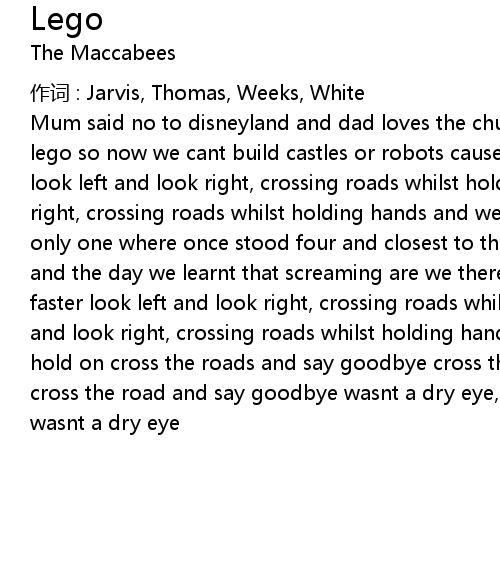 | Mum said no to disneyland and dad loves the church halluhjah and the boys chew lego so now we cant build castles or robots cause the pieces wont fit together look left and look right, crossing roads whilst holding hands look left and look right, crossing roads whilst holding hands and we' ll hold on, and we' ll hold on only one where once stood four and closest to the kitchen floor family favourite and the day we learnt that screaming are we there yet doesnt get you there any faster look left and look right, crossing roads whilst holding hands look left and look right, crossing roads whilst holding hands and we' ll hold on, and we' ll hold on cross the roads and say goodbye cross the road there wasnt a dry eye you cross the road and say goodbye wasnt a dry eye, cross the road wasnt a dry eye, wasnt a dry eye |