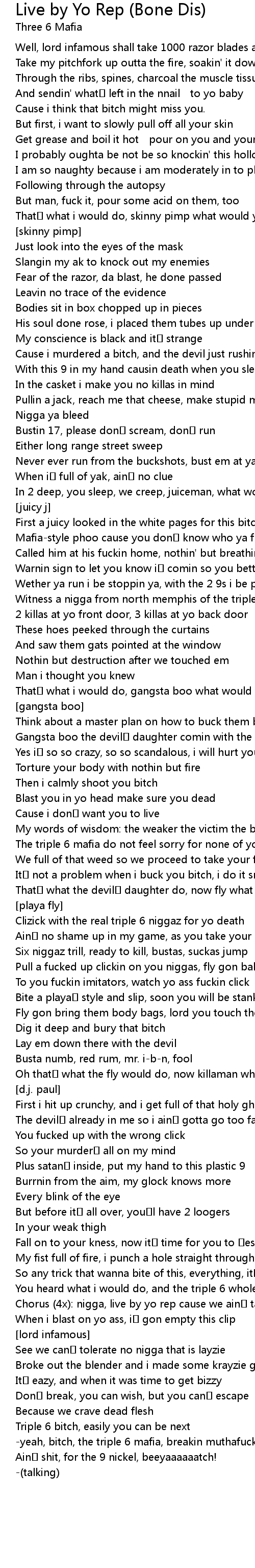 | -yeah, bitch, the triple 6 mafia, breakin muthafuckin bones like it | |