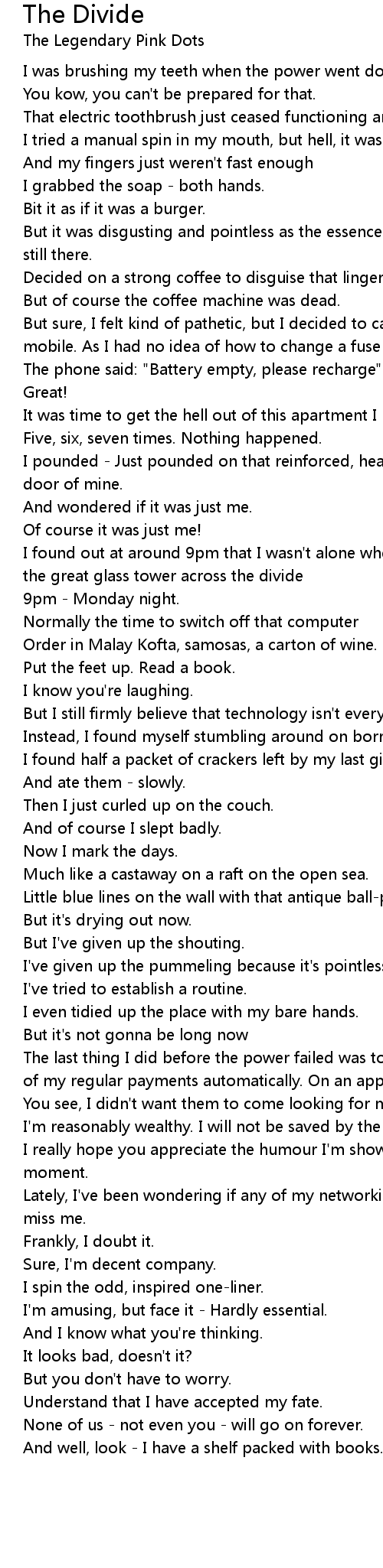 I found out at around 9pm that I wasn't alone when the first light went off in the great glass tower across the divide |