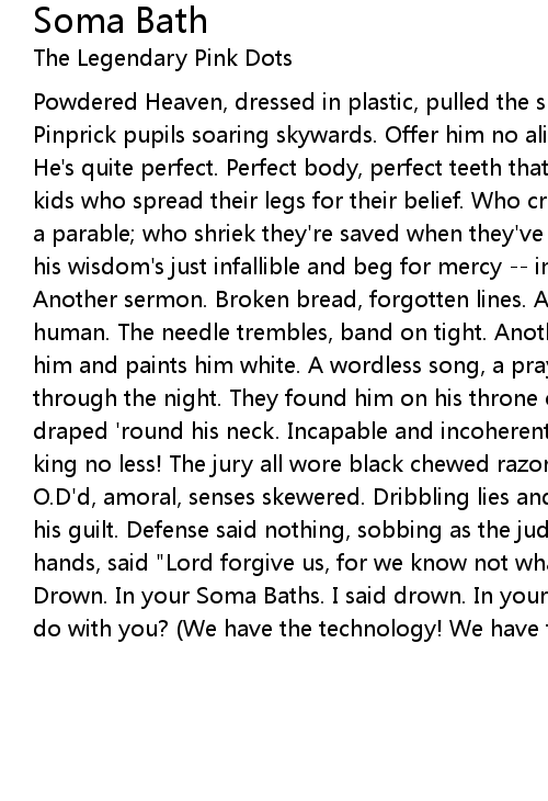 Powdered Heaven, dressed in plastic, pulled the shades down on his eyes. Pinprick pupils soaring skywards. Offer him no alibis. But then, who needs them? He's quite perfect. Perfect body, perfect teeth that flash sublime and blind the kids who spread their legs for their belief. Who cross themselves at the drop of a parable; who shriek they're saved when they've touched his jeans; who swear his wisdom's just infallible and beg for mercy -- in his dreams. Another day. Another sermon. Broken bread, forgotten lines. A line for comfort keeps him human. The needle trembles, band on tight. Another little perforation ventilates him and paints him white. A wordless song, a prayer to no-one, helps him whistle through the night. They found him on his throne of porcelain. A rusty chain draped 'round his neck. Incapable and incoherent. His eyes switched off but a king no less! The jury all wore black chewed razors. Witnesses looked D.O.A. O.D'd, amoral, senses skewered. Dribbling lies and tooth decay. They declared his guilt. Defense said nothing, sobbing as the judge turned blue. Washed their hands, said "Lord forgive us, for we know not what we do..." |