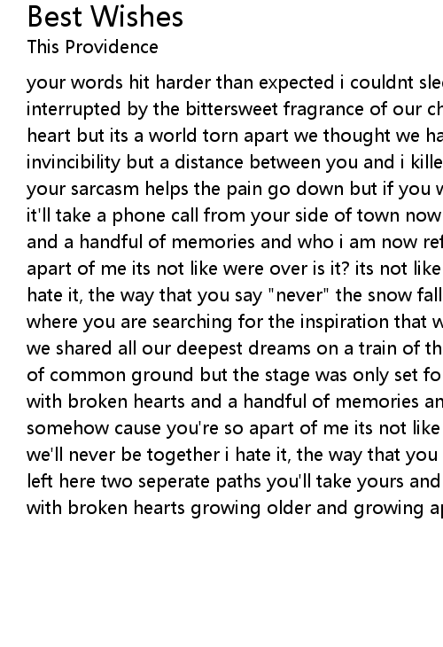your words hit harder than expected i couldnt sleep because my dreams were interrupted by the bittersweet fragrance of our childhood dreams filling my heart but its a world torn apart we thought we had what no one could ever have invincibility but a distance between you and i killed us gradually a spoonful of your sarcasm helps the pain go down but if you wanna mend my heart for a while it'll take a phone call from your side of town now were left with broken hearts and a handful of memories and who i am now reflects you somehow cause you're so apart of me its not like were over is it? its not like we'll never be together i hate it, the way that you say "never" the snow falls here you can see the stars where you are searching for the inspiration that we once found in every moment we shared all our deepest dreams on a train of thought that took us to the place of common ground but the stage was only set for a disappointment now were left with broken hearts and a handful of memories and who i am now reflects you somehow cause you're so apart of me its not like were over is it? its not like we'll never be together i hate it, the way that you say "never" and now were left here two seperate paths you'll take yours and i'll take mine we're left with broken hearts growing older and growing apart |