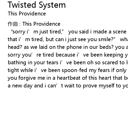 | " sorry i' m just tired," you said i made a scene and you replied " sorry that i' m tired, but can i just see you smile?" what was going through my head? as we laid on the phone in our beds? you always felt like you were wrong sorry you' re tired because i' ve been keeping you up half the night and bathing in your tears i' ve been oh so scared to lose you and holding on too tight while i' ve been spoonfed my fears if only i could love the way you do you forgive me in a heartbeat of this heart that beats for you well tomorrow' s a new day and i can' t wait to prove myself to you i' ll prove myself to you |