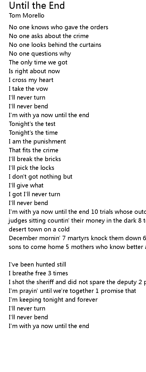 I'm with ya now until the end 10 trials whose outcome all fixed from the start 9 judges sitting countin' their money in the dark 8 towers of iron surround the desert town on a cold |