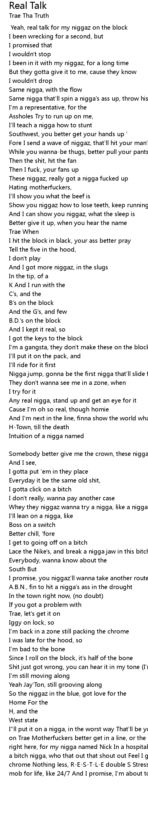 I"ll put it on a nigga, in the worst way That'll be your worst day, and I put it on Trae Motherfuckers better get in a line, or the dirt where you gon lay This right here, for my nigga named Nick In a hospital bed, half gone I'll run up on a bitch nigga, who that out that shout out Feel I gotta hit his ass, with the chrome Nothing less, R-E-S-T-L-E double S Stress, got a nigga on amp So I gott mob for life, like 24/7 And I promise, I'm about to be the champ