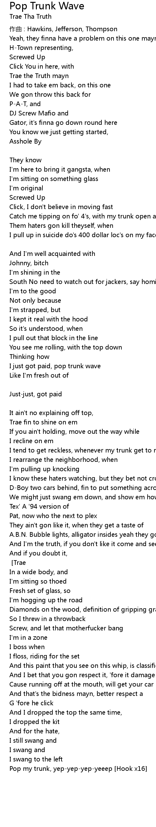 | Pop my trunk, yep-yep-yep-yeeep [Hook x16] |